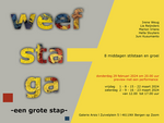 - In "weef-sta-ga-een grote stap" tonen vijf kunstenaars hun maatschappelijke betrokkenheid bij de mens en de natuur. Een proces van weven, reflecteren en aanpassen. Totdat de opgedane kennis en ervaring in het uiteindelijke kunstwerk zichtbaar wordt. Soms heel concreet en soms juist dromerig met ruimte voor fantasie. Kunst met verhalen die bijdragen aan herkenning, bewustwording of inspiratie.