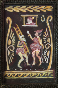 2021Vrij naar Griekse vaas illustratie “Blijspelscène Hermes en Zeus” ca 370 v Chr