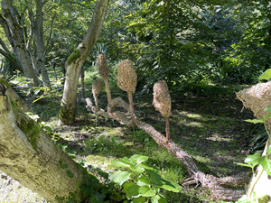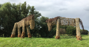 2019Paard van gevlochten en gebreid gras, manen van berkenhout en sokken van coniferen. Schuitvlotpaarden trekken naast de vliet de bietenschepen. Ze staan naast de Vliet bij Bovensas. De paarden zijn op ware grootte van Belgische trekpaarden. Hun hoofden wuiven zachtjes in de wind. Prijs per paard is € 250,-