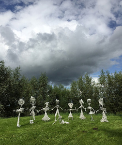 2019Groep figuren uit de jaren 70, opgebouwd uit ijzerdraad en gehaakt plastic.