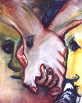 2005Naar aanleiding van het doven handalfabet een ritmisch schilderij in olieverf en ijzerdraad. De beweeglijkheid van de schaduw van het ijzerdraad versterkt de taal van de geschilderde handen.